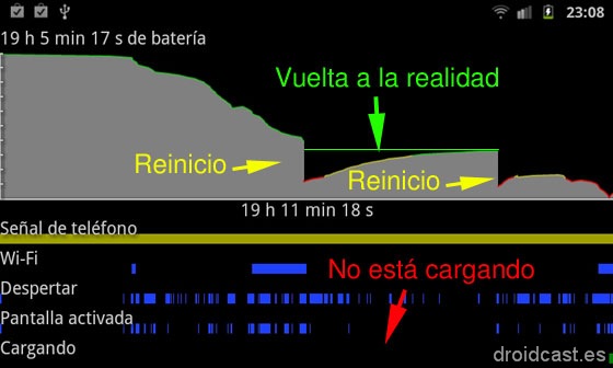 Os muestro una imagen en la que vemos como cae abruptamente el rendimiento de la batería tras un reinicio y posteriormente se va recuperando a medida que pasa el tiempo. El problema está en una mala información de la carga y no que ésta descienda de manera repentina. Como vemos en el gráfico, en ningún momento hasta el final estamos cargando el dispositivo.